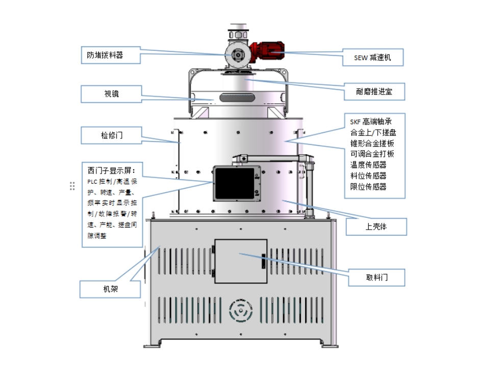 1、智能進料防堵裝置:采用新型防堵結構設計,保證物料暢通不堵塞。